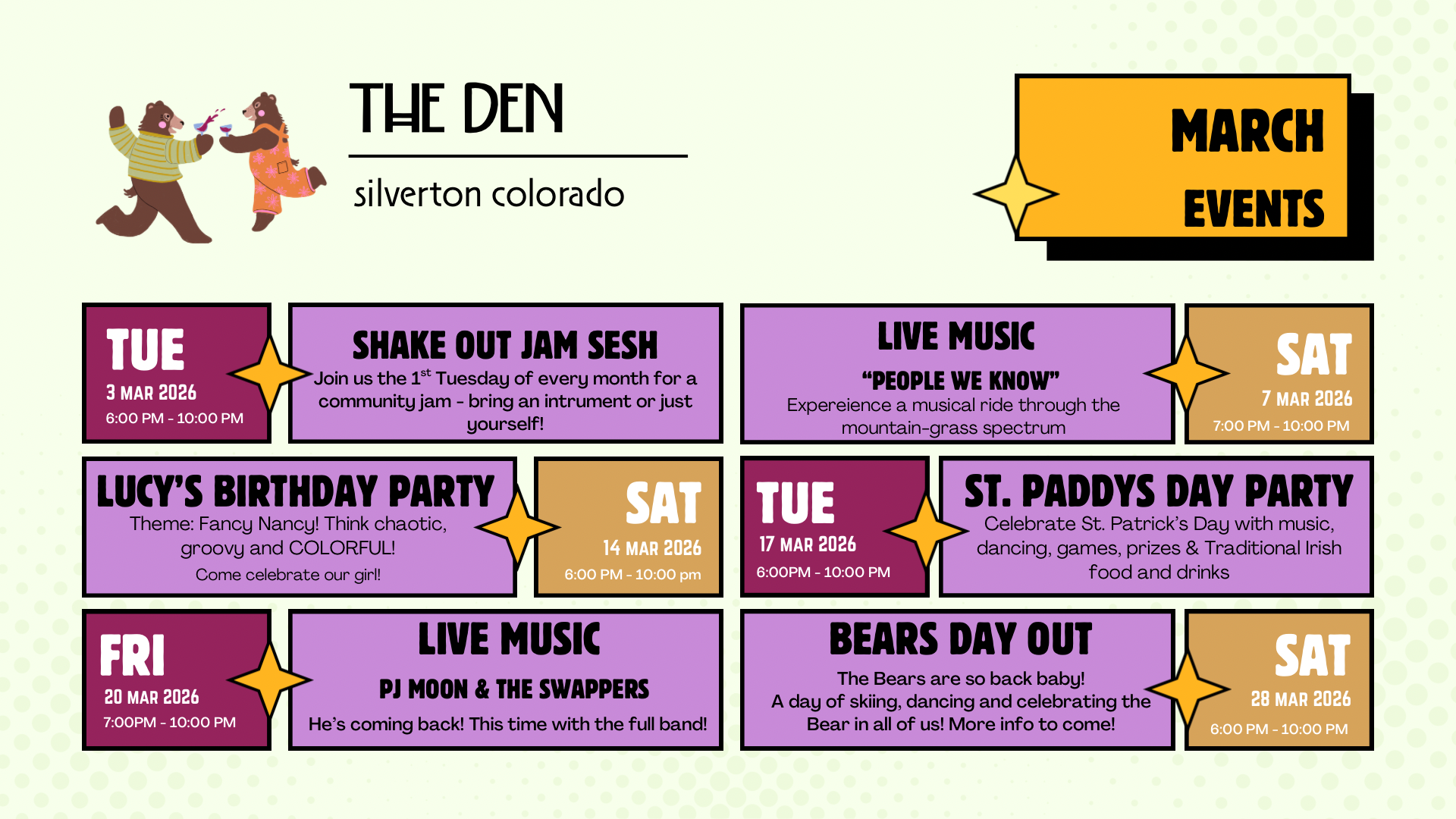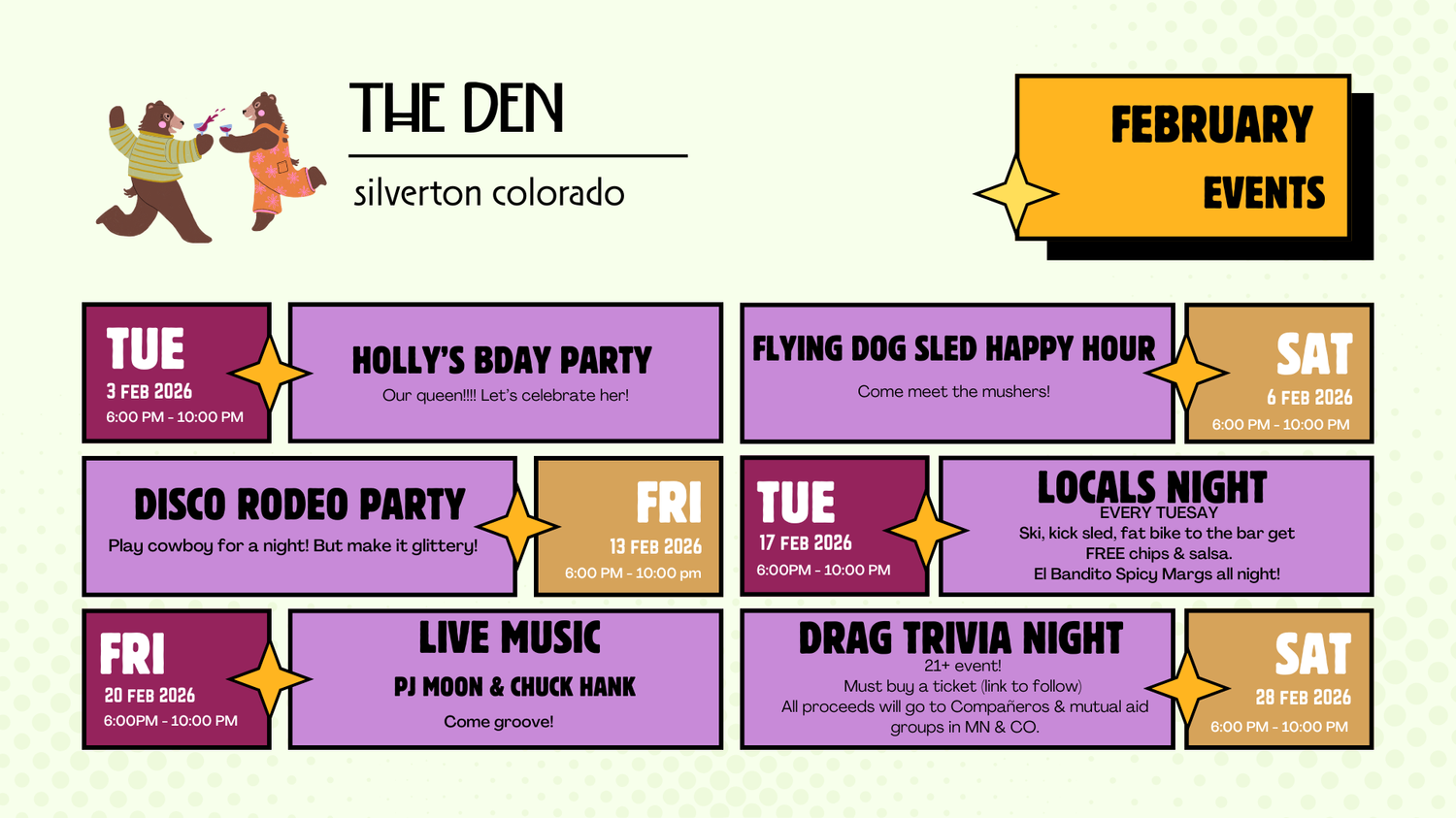 Tucked inside the Coffee Bear on Tuesdays, Fridays, and Saturdays, The Den keeps your post-adventure stoke alive. Serving beer, cocktails and plenty non-alcoholic options for whatever your heart desires! Grab a beer and snack on a hot dog (or 15) while going for gold at our season long hot dog eating contest. There are always exciting things happening at The Den! And nothing says "après bar" like good vibes, good people, and a disco ball silently encouraging your funkiest dance moves.